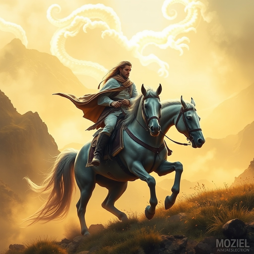 A majestic horse rider traverses a dramatic landscape, captured in the sweeping style of cinematic montages. Inspired by dragon art and infused with the surreal touch of Franciszek Starowieyski, the scene is bathed in a palette of glowing yellow and pristine white. The intricate, hyper-realistic details evoke the meticulous artistry of John Howe, while subtle influences of Himalayan art add a layer of mystique to the composition. The rider, a central figure of grace and power, moves effortlessly amidst an epic backdrop, evoking a sense of timeless adventure and mythical grandeur.