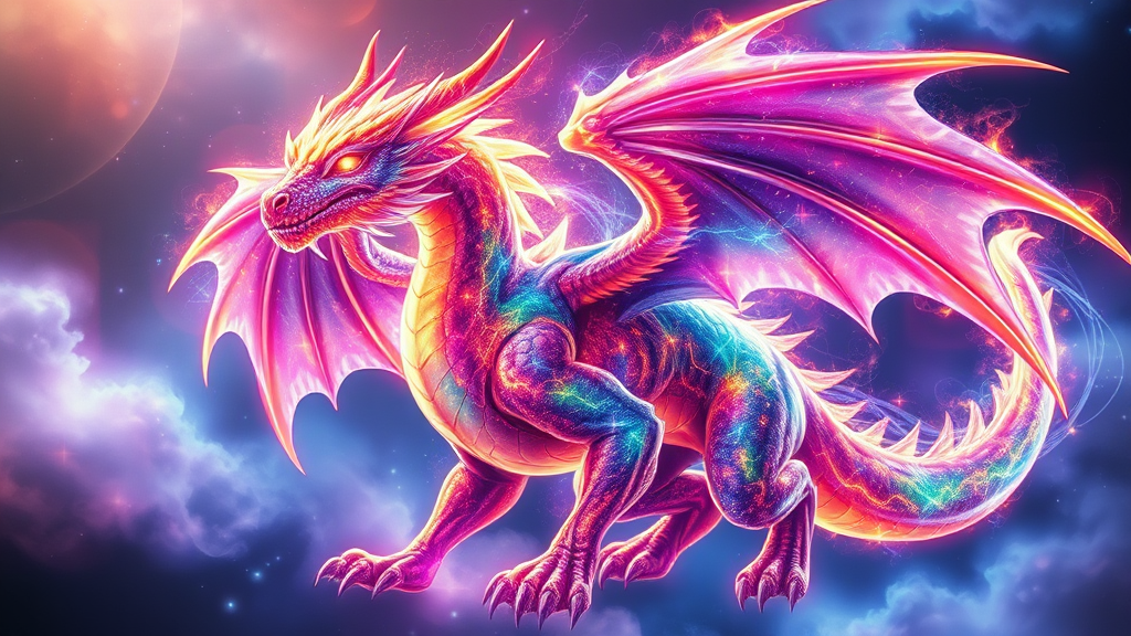 A majestic humanoid dragon composed of pure, radiant energy, adorned with a spectrum of vibrant colors that shimmer and dance across his form. His handsome features exude an otherworldly charm, his eyes glowing with an intense inner light. The energy that makes up his body swirls and pulsates, giving the impression of a living, breathing nebula. His wings, expansive and iridescent, fan out majestically, casting a kaleidoscope of colors in their wake, while his scales glisten with electric hues, reflecting the essence of a cosmic storm.