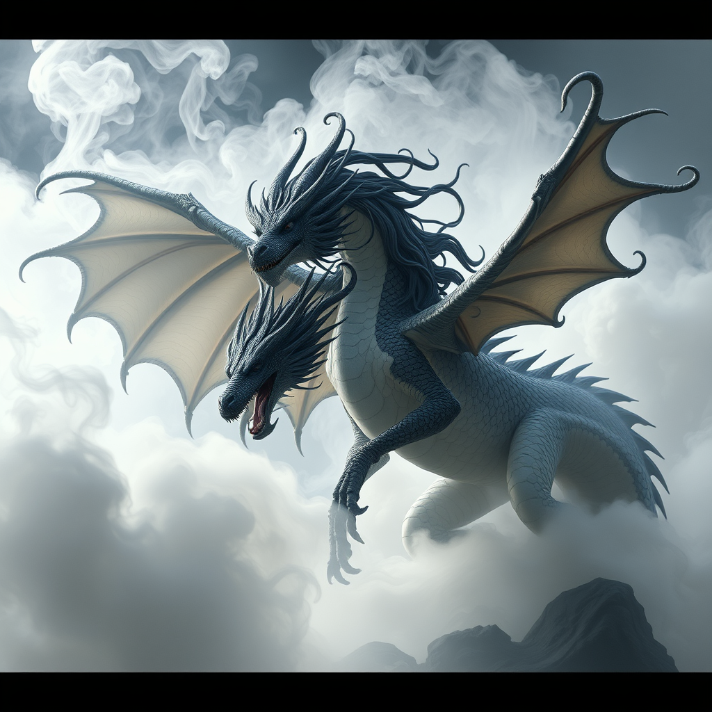 A majestic, immense dragon exuding a regal aura, with flowing obsidian hair and intricately scaled wings, embodies the essence of Magic the Gathering. Its alabaster skin contrasts vividly against a swirl of spiraling smoke, set against a backdrop of ethereal white fog. Crafted in the style of Andrei Riabovitchev, JohnnyD, Massimo Caggese, and Peter Mohrbacher, the image captures an ominous and intricate atmosphere, enhanced by octane rendering and the surreal touch of Moebius. Photographed in the captivating style of Arney Freytag, the dragon strikes a stunning pose reminiscent of a high-fashion photo shoot on ArtStation, with dramatic lighting casting deep shadows and evoking orthodox symbolism. This concept art piece is an ambient exploration of magic realism, rendered in hyper-maximalist detail that creates a cinematic tribal dark fantasy world in 8k resolution, maintaining the complexity and stylistic nuances that define this incredible vision.