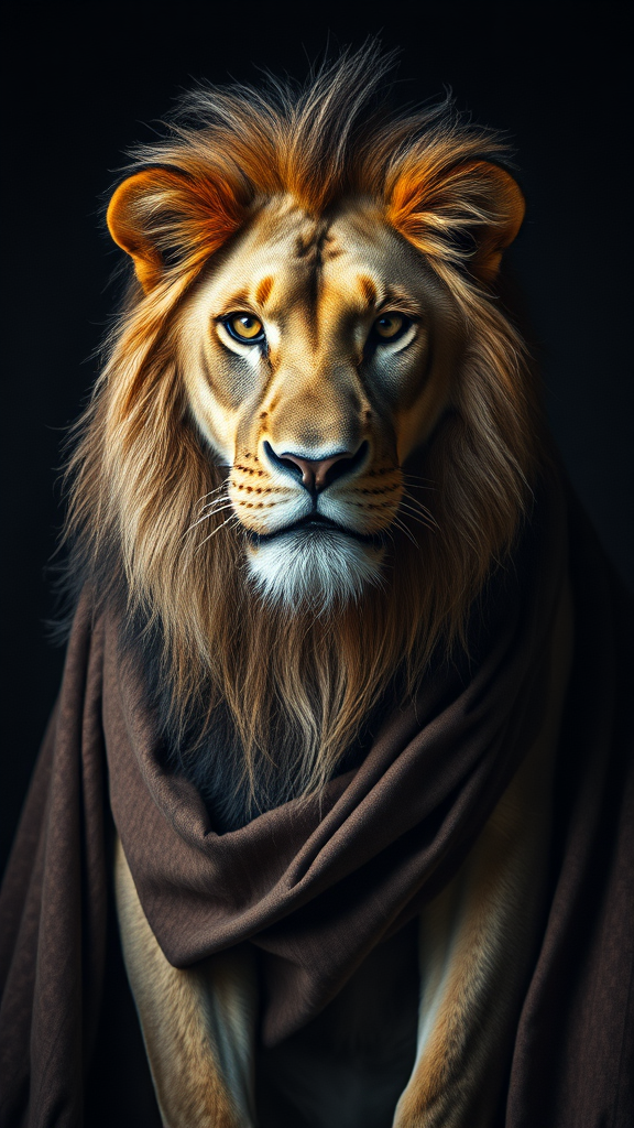 A majestic lion captured in a striking photograph by Lee Jeffries, its eyes brimming with intensity and emotion, set against a deep, shadowy backdrop. The lion's body is perfectly proportioned, draped in intricately detailed, lifelike clothing that enhances its noble presence. The image captures the full essence of the lion, highlighting its regal stance and powerful aura with extreme clarity and realism in every detail.