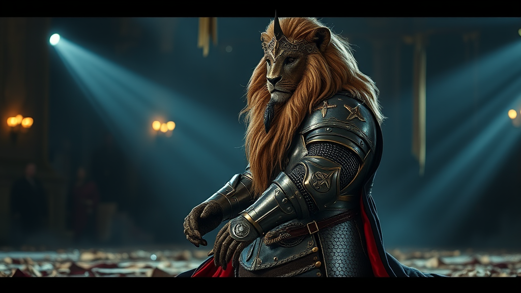 A majestic lion knight kneels in a reverent pose, his finely detailed armor glistening under cinematic lighting, with intricate designs in silver intertwined with rich silk accents. The scene is illuminated by dramatic lighting, highlighting the knight's noble posture and the time-honored craftsmanship of his armor, capturing the moment in stunning 4k clarity.