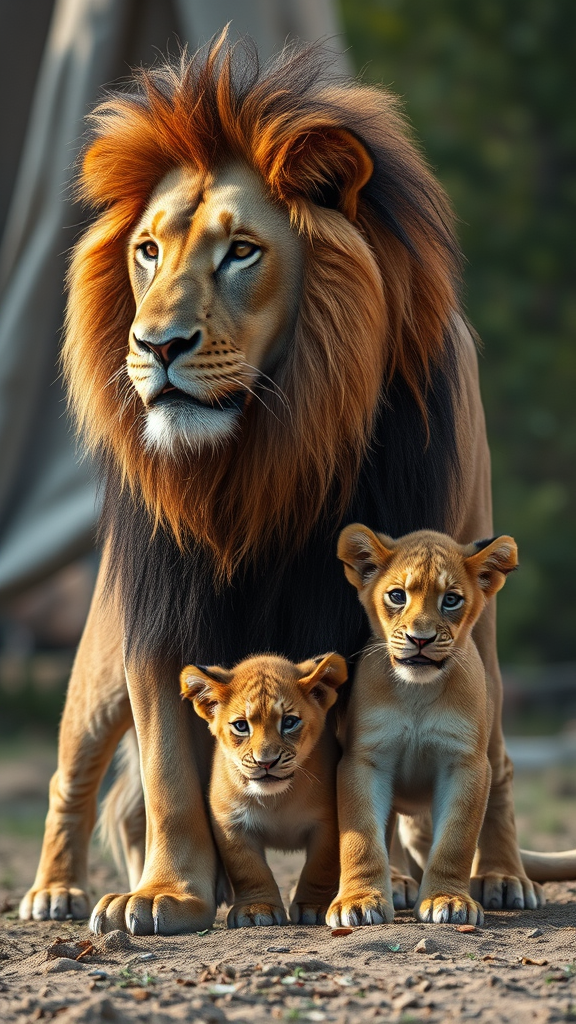 A majestic lion standing protectively over his playful cubs, captured with the high precision of a Nikon D850. The scene harmoniously blends natural beauty with subtle man-made elements, richly colorized to enhance their regal presence. Inspired by the ethereal style of Jessica Drossin and the immersive focus of Alasdair McLellan, the image embodies pristine naturalism and powerful symbolism. Ultra-detailed and photorealistic, it achieves cinematic, movie-quality rendering through the use of advanced octane rendering techniques. The scene is focused and layered with depth of field, featuring real shadows and intricate VFX post-production. Enhanced by RTX ray tracing lighting, every detail is brought to life in 32k UHD resolution, capturing the essence of family, strength, and the wild in exquisite detail.
