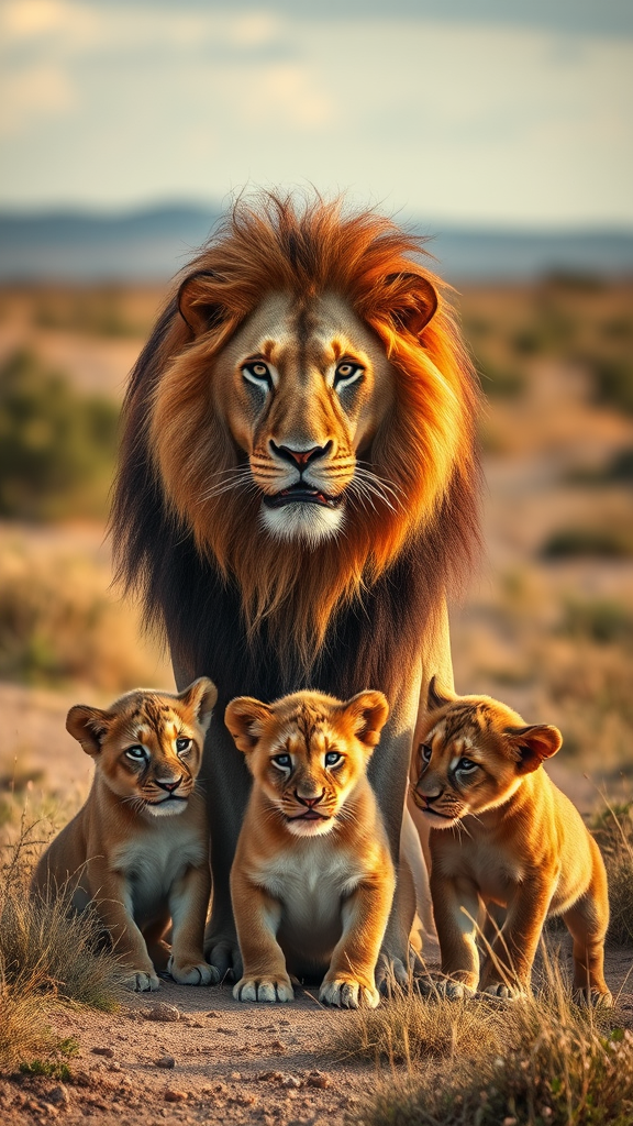 A majestic lion stands protectively with his playful cubs in a serene savannah, captured in the ultra-realistic style of a Nikon D850. The scene skillfully blends natural and man-made elements, featuring vibrant colors reminiscent of Jessica Drossin and Alasdair McLellan's works. The setting exudes pristine naturalism with powerful symbolism, showcasing the circle of life. Every detail is meticulously crafted, achieving the highest quality with cinematic, movie-like rendering. Octane rendering brings an ultra-detailed, photorealistic touch, with focused depth of field and authentic shadows. The lighting is enhanced by VFX post-production and RTX ray tracing, offering a breathtaking 32k UHD experience, depicting the bond between the lion and his cubs in an artistic yet realistic portrayal.