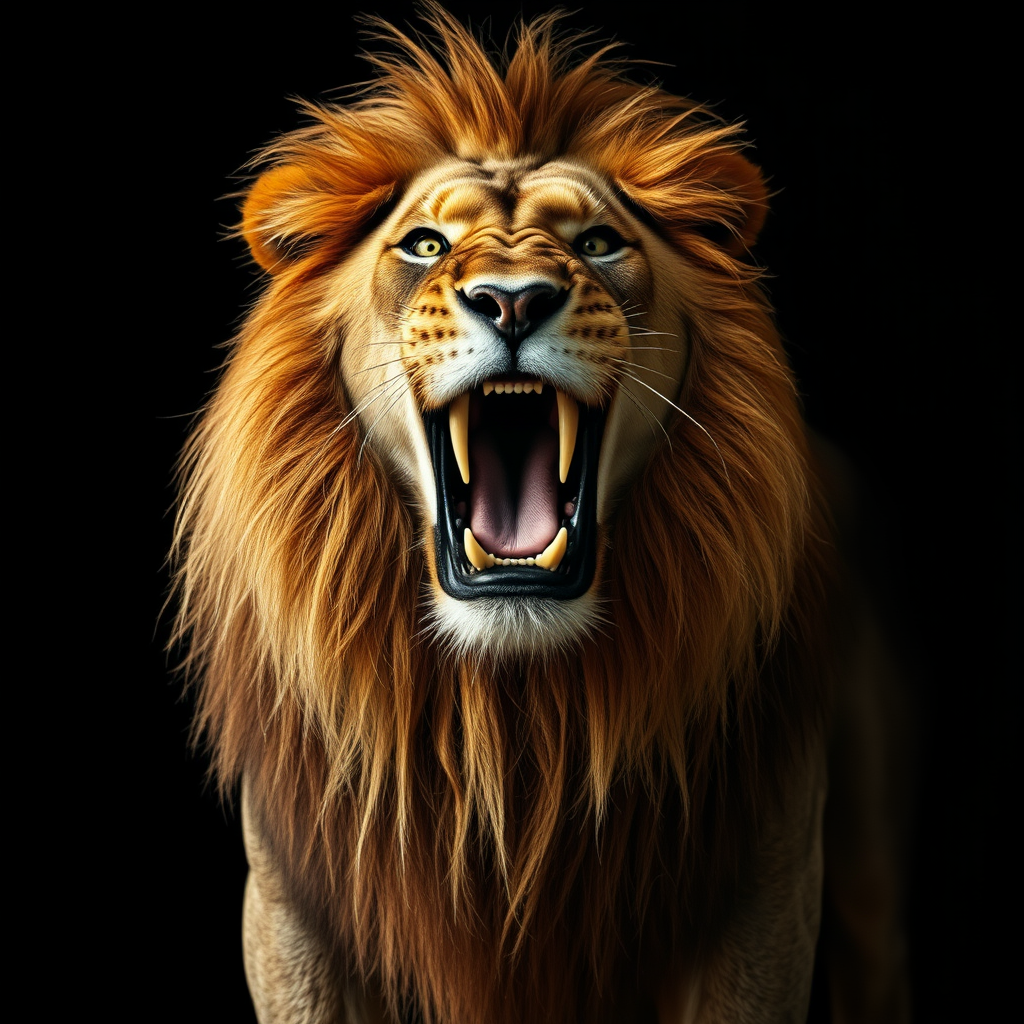 A majestic lion with a powerful roar captured by Lee Jeffries, featuring intensely expressive eyes and a shadowy background. The lion's body is perfectly proportioned, adorned in photo-realistic garments with intricate details. A full-body portrait that captures the wild essence and regal presence of the creature, highlighting the fine textures of its mane and the intricacy of its attire.