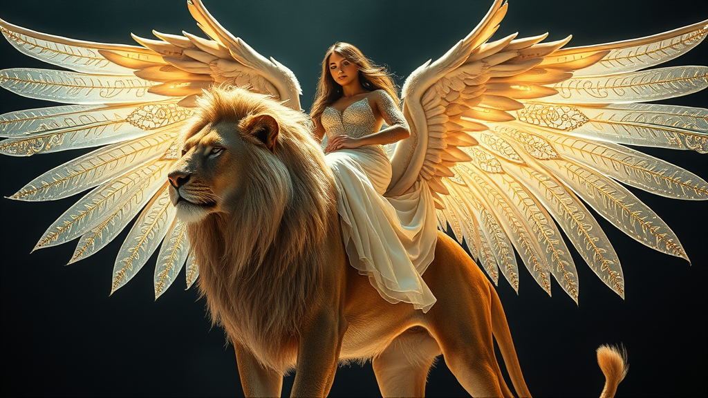 A majestic lion with angelic qualities stands proudly, its sleek, feathery wings glowing with intricate transparence. A graceful woman rides atop the lion, her presence serene and commanding. The textures are symmetrically detailed, with accents of pearl filigree that catch the light. This concept art, influenced by the styles of Alice X. Zhang and Andreas Lie, captures a perfect composition. The scene, a masterpiece of professional photography, showcases glittering detail with a macro perspective. Natural lighting enhances the ethereal quality, captured with the sharp focus of a 64-megapixel DSLR Canon lens.