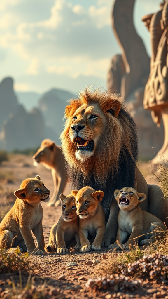 A majestic lion with his playful cubs amidst a surreal landscape where natural and man-made elements harmoniously intertwine, captured in the exquisite style of a Nikon D850. The scene is infused with the evocative touch of Jessica Drossin and Alasdair McLellan, embodying pristine naturalism and powerful symbolism. The environment is rendered with ultra-realistic, cinematic quality, boasting highest detail and photorealism. The composition features an artful blend of focused depth of field and realistic shadows, enhanced by VFX post-production and RTX ray tracing lighting, all in stunning 32k UHD. Elements such as sculptural rock formations and architectural marvels are subtly integrated, adding layers of intrigue. The mood conveys a cinematic narrative quality, with dynamic lighting that evokes a sense of both grandeur and intimacy, as if each frame tells a story of legacy and kinship, captured with breathtaking detail and artistry.