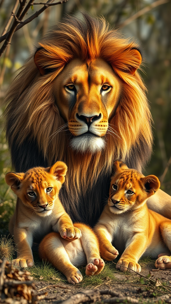 A majestic lion with his playful cubs in a serene setting, captured in the hyper-realistic style of a Nikon D850 photograph. This scene blends organic and artificial elements, accentuating the contrast between them. Inspired by the artistic approaches of Jessica Drossin and Alasdair McLellan, the image embodies pristine naturalism and profound symbolism. Crafted with ultra-detailed precision, the visual is cinematic and movie-quality in its execution, utilizing octane rendering for lifelike detail. The composition is focused with an intentional depth of field, incorporating real shadow effects and post-production VFX enhancements. RTX ray tracing lighting ensures immersive illumination, presented in stunning 32k UHD.