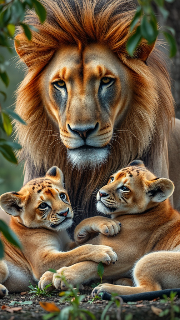 A majestic lion with his playful cubs in a stunningly detailed and ultra-realistic scene, reminiscent of the Nikon D850 style, where the natural world seamlessly merges with subtle man-made elements. The setting is enriched by vibrant colors, inspired by the artistry of Jessica Drossin and Alasdair McLellan, capturing the essence of pristine naturalism and powerful symbolism. Every hair and leaf appears in ultra-high detail, creating a cinematic and movie-quality rendering with depth of field that draws the viewer in. Realistic shadows and VFX post-production techniques, including RTX ray tracing lighting, enhance the scene, bringing it to life with 32k UHD clarity. The composition is perfectly focused, offering a breathtaking view of the powerful bond between the lion and his cubs, portrayed with cinematic flair and the highest quality detail possible.