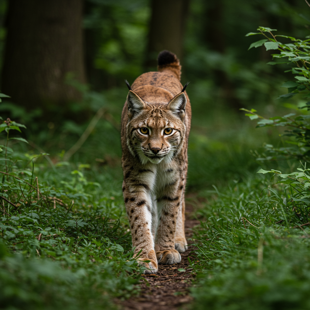 A majestic lynx stealthily stalking its prey, captured from a front-facing, low angle perspective in a dense, verdant forest. The scene is rich with natural light that highlights the exceptional detail and photorealism of the award-worthy wildlife shot. The lynx's movement is fluid and stealthy, with every muscle and leg rendered with precise anatomical accuracy. The depth of field focuses on the predator's intense gaze, bringing its expressive eyes into sharp focus, while the lush forest background softly blurs. Shot with a 70mm lens, the image boasts an 8k resolution and 16 megapixels, ensuring every whisker and leaf is crisply defined.