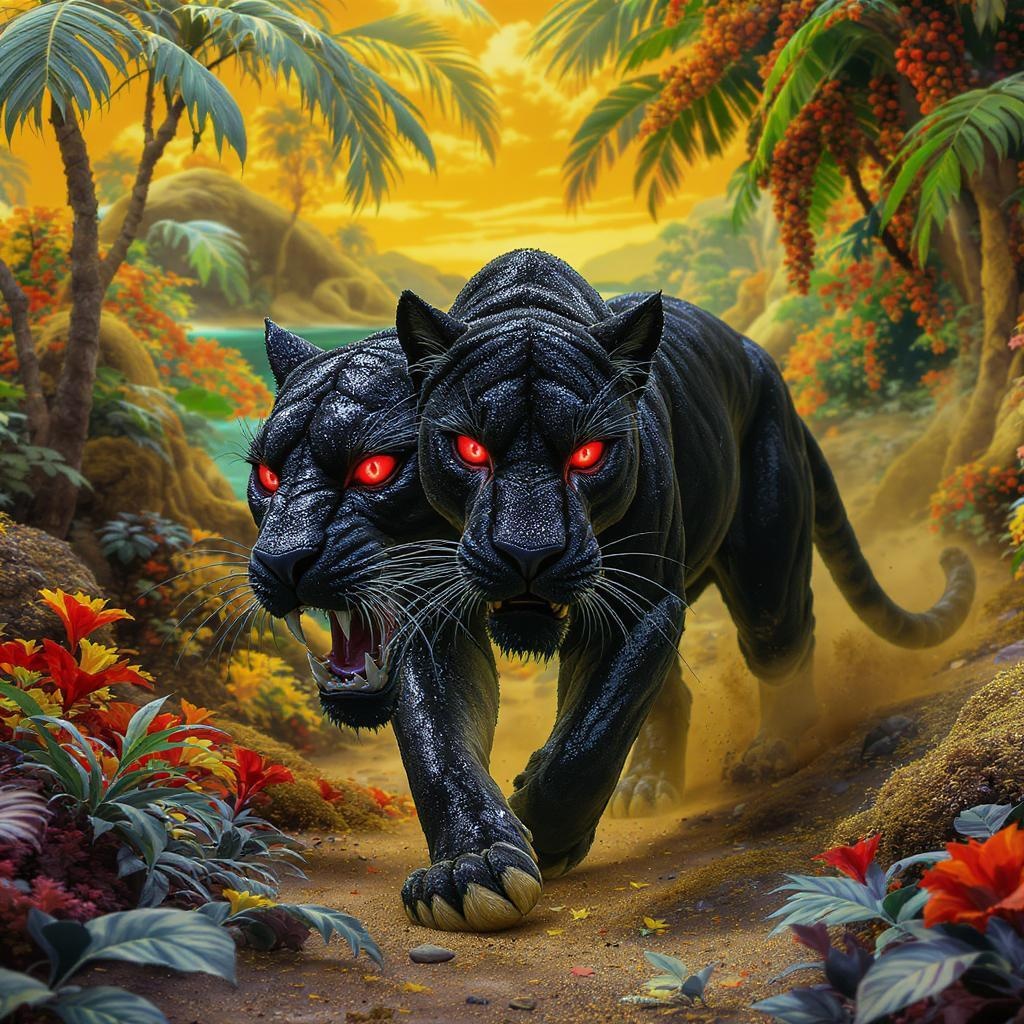 A majestic panther crafted from shimmering obsidian sand prowls through a vibrant, Gauguin-inspired landscape, its sleek form contrasting starkly against a tapestry of lush, exaggerated foliage and vivid tropical colors. The creature's piercing red eyes glint with intensity, adding an enigmatic allure to the dreamlike scene surrounding it.