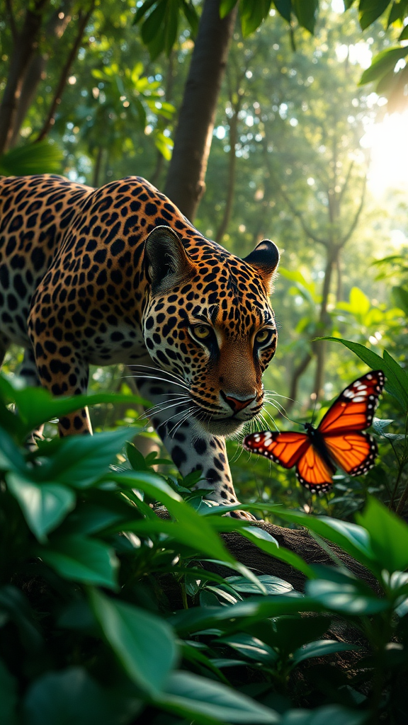 A majestic panthera onca prowls through the lush rainforest, its spotted coat blending seamlessly with the dappled sunlight filtering through the canopy. Nearby, the vibrant colors of a phimeis dives catch the eye, fluttering gracefully among the foliage. Captured with a Canon EOS Rebel SL2 paired with an EF100mm f/2.8L Macro IS USM lens, the scene is frozen with stunning clarity at 100mm, f/2.8, 1/1000s, bringing every detail of the jaguar's sleek muscles and the butterfly's delicate wings to life.