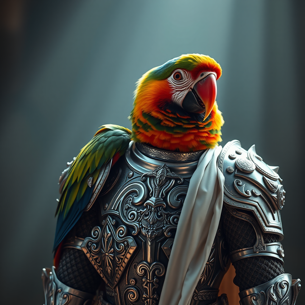 A majestic parrot knight, its vibrant plumage a striking contrast against the finely detailed silver armor, stands proudly in a cinematic display. The armor features intricate designs, weaving patterns reminiscent of ancient tales, with silver accents gleaming under the dramatic lighting. Silk drapes elegantly from its shoulders, adding an aura of regality. This portrait, captured in stunning 4k resolution, showcases the interplay of light and shadow, highlighting the noble and fierce demeanor of this unique warrior.