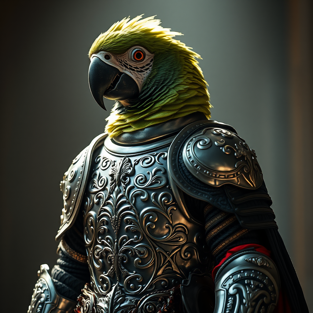 A majestic parrot knight stands regally, its finely detailed armor gleaming under cinematic and dramatic lighting. The intricate designs of silver filigree intertwine gracefully across the armor, with accents of vibrant silk peeking through. The scene captures a 4k portrait showcasing the noble avian warrior, exuding an air of valor and elegance amidst the play of light and shadow.