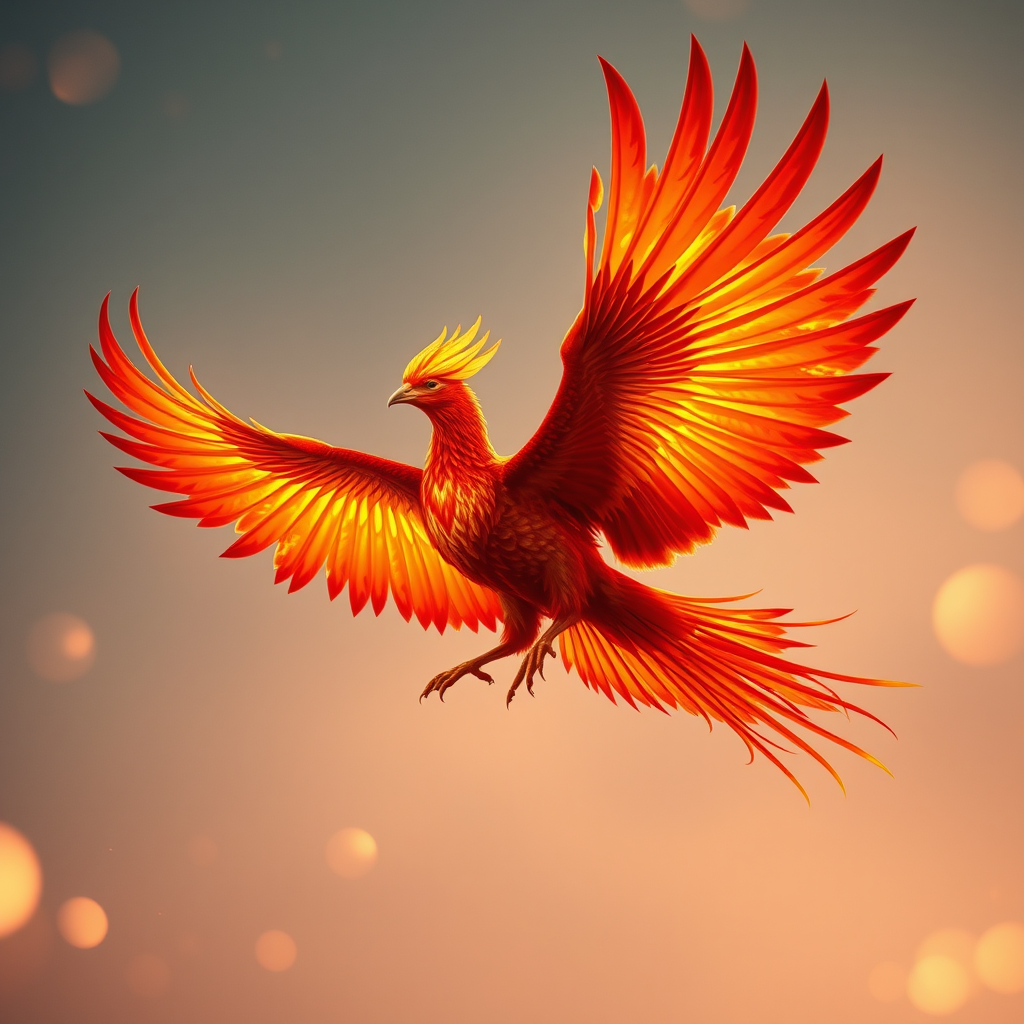 A majestic phoenix bird with blazing, fiery wings glides through the sky, embodying the essence of three prokaryotic cells for resilience, one nuclear core for strength, captured through the lens of a high-quality DSLR camera. The scene is painted in rich vermillion hues, with a stunning depth of field that brings every detail into sharp focus, all set against a dynamic 9:16 aspect ratio, showcasing the mythical creature's grandeur in vivid quality.