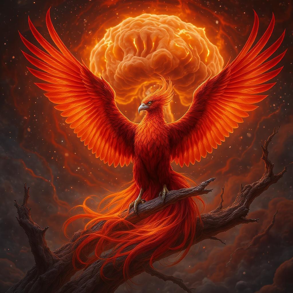 A majestic phoenix bird with blazing, fiery wings in shades of vermillion, captured with the precision and clarity of a DSLR camera, set against a striking background showcasing a dynamic depth of field, merging elements reminiscent of ancient prokaryotic forms with the vibrant energy of a nuclear scene.