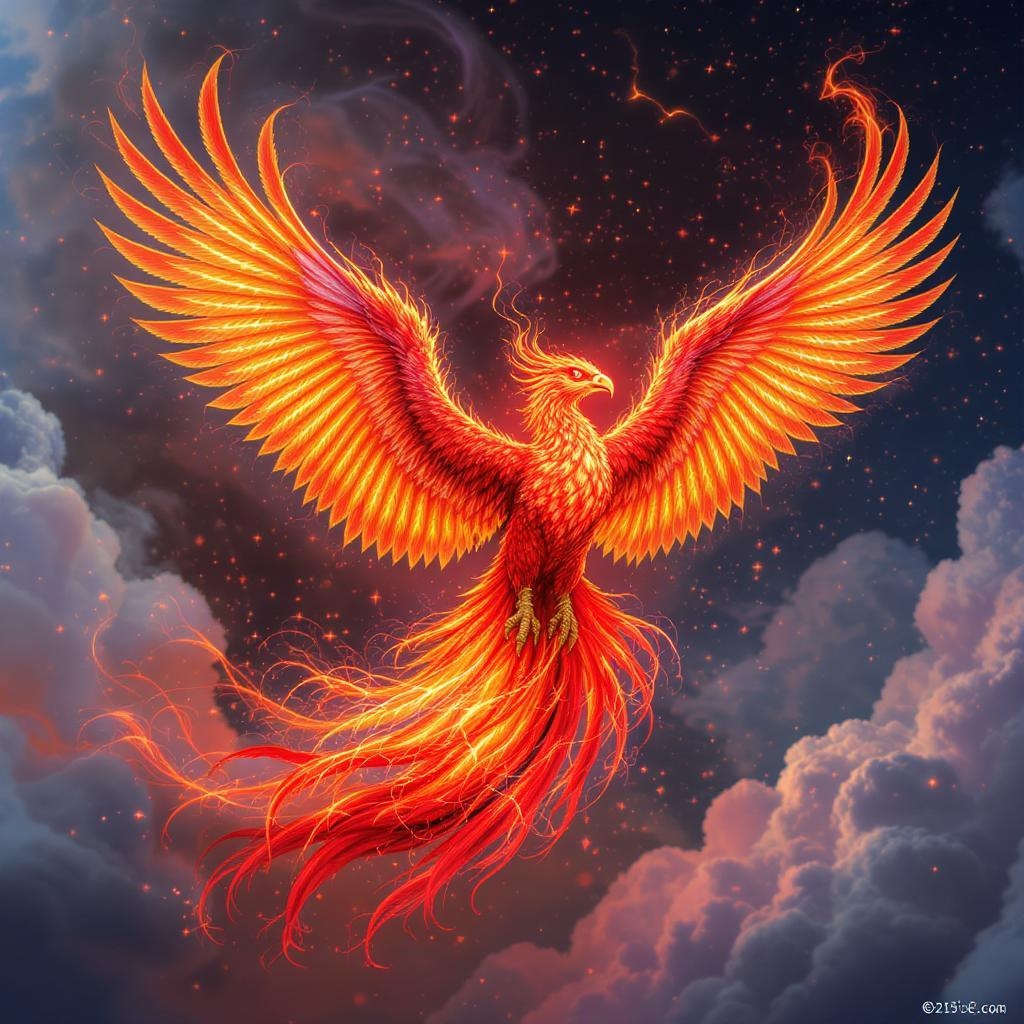 A majestic phoenix bird with flaming wings, capturing the essence of a mythical creature, soaring through the sky with a prokaryotic aura, centered around a vibrant vermillion hue. The scene is captured with a DSLR, highlighting a sharp depth of field, bringing the intricate details of the feathers to life against the expansive 9:16 backdrop. The quality encapsulates the fiery energy and the mystical essence of its nuclear core.