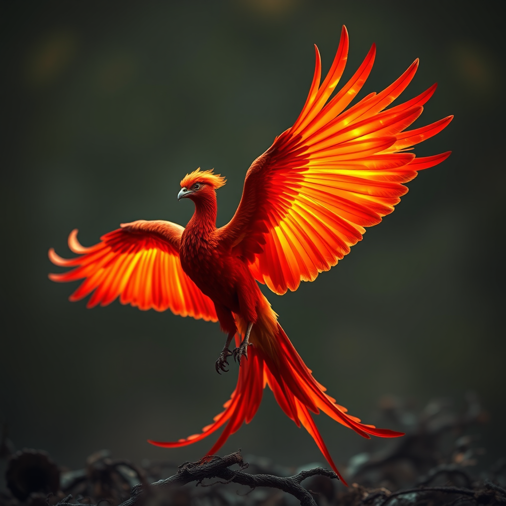 A majestic phoenix bird with flaming wings in radiant vermillion hues, set against a backdrop with a depth of field effect, akin to a high-quality DSLR capture, evoking the simplicity and raw nature reminiscent of prokaryotic structures, with a focus on nuclear brilliance, emphasizing the fiery essence of rebirth and transformation, captured in a striking 9:16 aspect ratio.