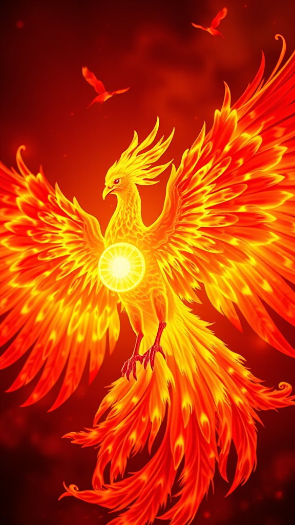 A majestic phoenix bird with vibrant flaming wings, embodying the essence of 3 prokaryotic elements intertwined with a single, glowing nucleus, captured through a DSLR lens. The scene is painted in rich vermillion hues, with a striking depth of field that highlights the intricate details of the bird in an aspect ratio of 9:16, showcasing a world where ancient biology meets fiery myth.