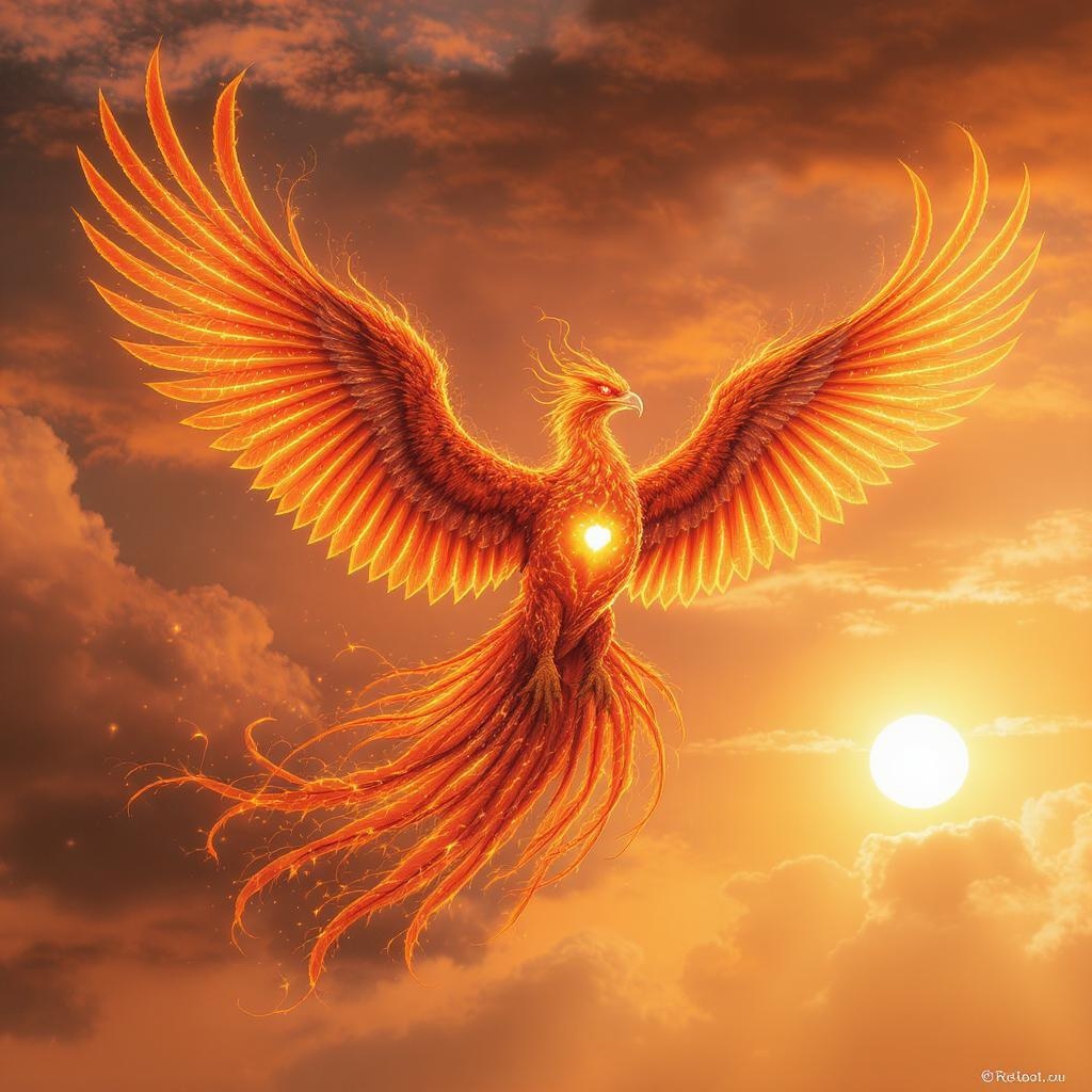 A majestic phoenix bird with vibrant flaming wings soaring through the sky, embodying a powerful energy akin to a prokaryotic life form, contrasted against a singular glowing nucleus at its heart. Captured in stunning detail with a DSLR-like precision, the scene radiates warm vermillion hues, creating a striking depth of field against the backdrop of a sunlit horizon, maintaining a balanced aspect ratio of 9:16 with enhanced visual quality.