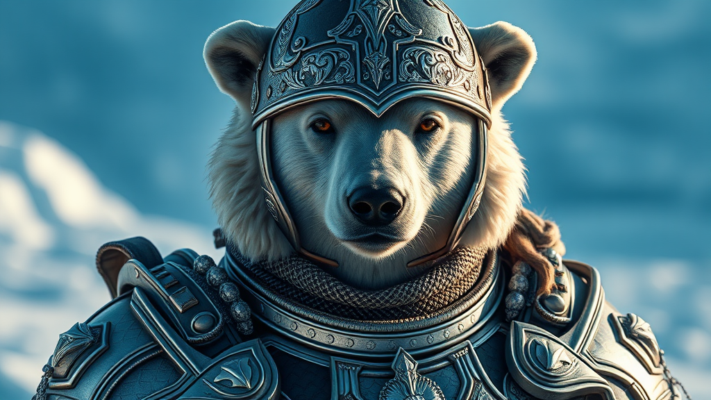 A majestic polar bear warrior, clad in a finely detailed suit of armor, stands proudly, his helmet glinting in the cinematic lighting. The armor, an intricate design of silver and silk, reflects dramatic light, enhancing every contour. His noble eyes peer through the visor, exuding strength and wisdom. The background is a frosty landscape, offering a striking contrast to the warmth of his presence, captured in stunning 4k resolution.