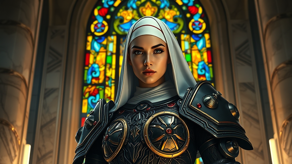 A majestic portrait of a devout Sister of Battle standing resolutely in an action scene, her striking presence framed by a vibrant stained glass window. She wears intricately designed sci-fi nun armor, capturing the Warhammer 40k aesthetic, while her symmetrical face is detailed with reflective eyes, dark eyebrows, and subtle mascara. The setting features marble walls illuminated with dust particles, enhanced by dramatic rim and chiaroscuro lighting, creating a powerful atmosphere. Inspired by professional majestic impressionism oil paintings, the scene echoes the styles of Waterhouse, John Constable, and others. The captivating artwork, trending on ArtStation and CGSociety, showcases intricate, high-detail compositions reminiscent of Studio Ghibli and Makoto Shinkai, featuring two dynamic characters in a rich, high-definition tableau.