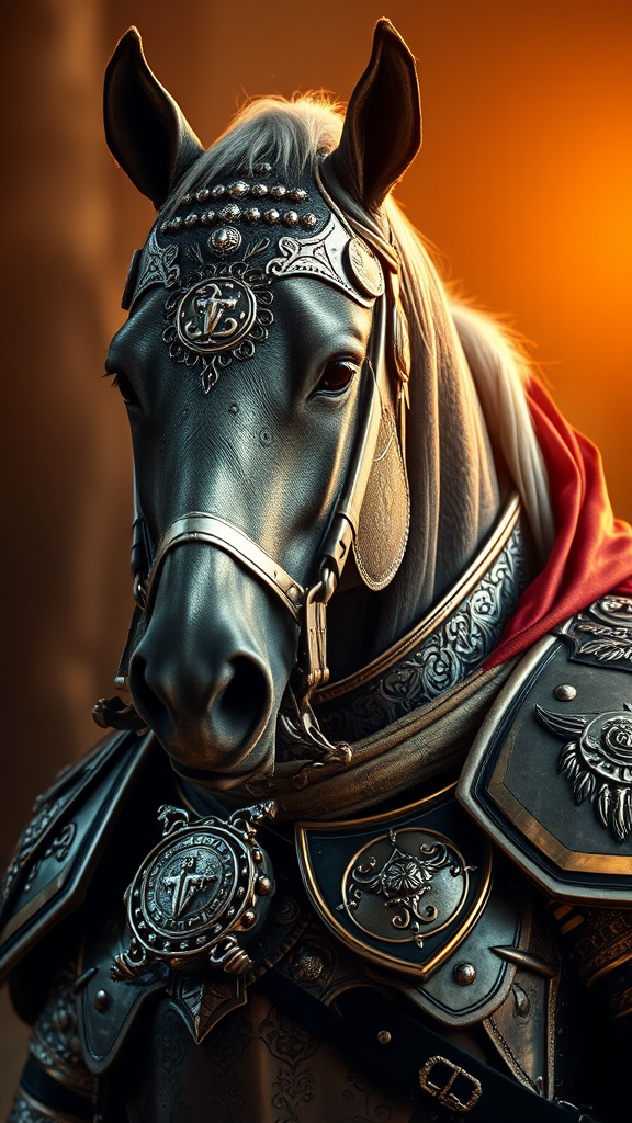 A majestic portrait of a horse knight adorned in exquisitely detailed armor with intricate patterns, shimmering in silver hues, and complemented by luxurious silk accents, basking in the glow of cinematic and dramatic lighting, captured in stunning 4k clarity.