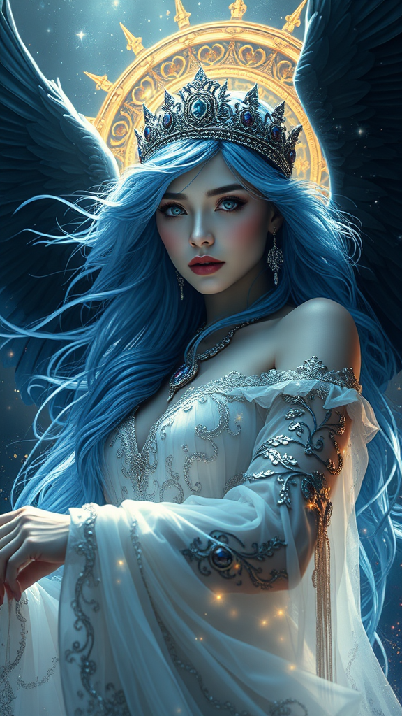 A majestic queen of ravens, embodying a femme fatale aura, wields her cosmic powers, with icy blue hair flowing like cosmic plumes. Her eyes, akin to Pantone 2766, pierce through a World of Warcraft-inspired realm. She is adorned in a delicate silk gossamer gown, reminiscent of the cosmos, interwoven with stars and galaxies. This full-body portrait, reminiscent of John Singer Sargent's style, features an ethereal crown, intricately adorned. Captured from a low angle, she is caressed by god rays and radiant light, a nod to Greg Rutkowski's work. A luminous, iridescent golden halo serves as her backdrop, set against a hyper-realistic, detailed environment. Approached with an art station's dark fantasy vibe, the scene boasts atmospheric hyperrealism, an epic wide shot in ultra-realistic illustration. It is cinematic, with sharp focus and octane render, presenting an awe-inspiring, photorealistic composition.