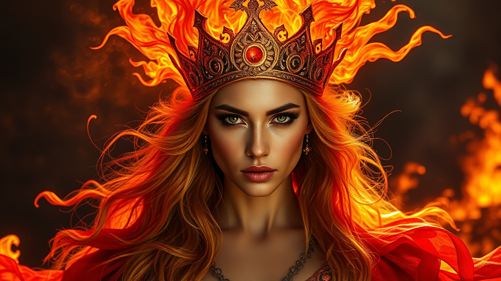A majestic queen with an ethereal presence, her crown composed of swirling, radiant flames. Her intense gaze captures a commanding yet graceful demeanor, as her fiery tresses cascade down her shoulders. The scene is enveloped in epic, dramatic lighting, casting flickering shadows that dance around her. Her attire is intricately detailed, reflecting the hues of a smoldering fire—reds, oranges, and hints of gold—emphasizing her regal and powerful aura. The background hints at a scorched landscape, adding depth and contrast to her striking figure, embodying both beauty and the raw power of fire.