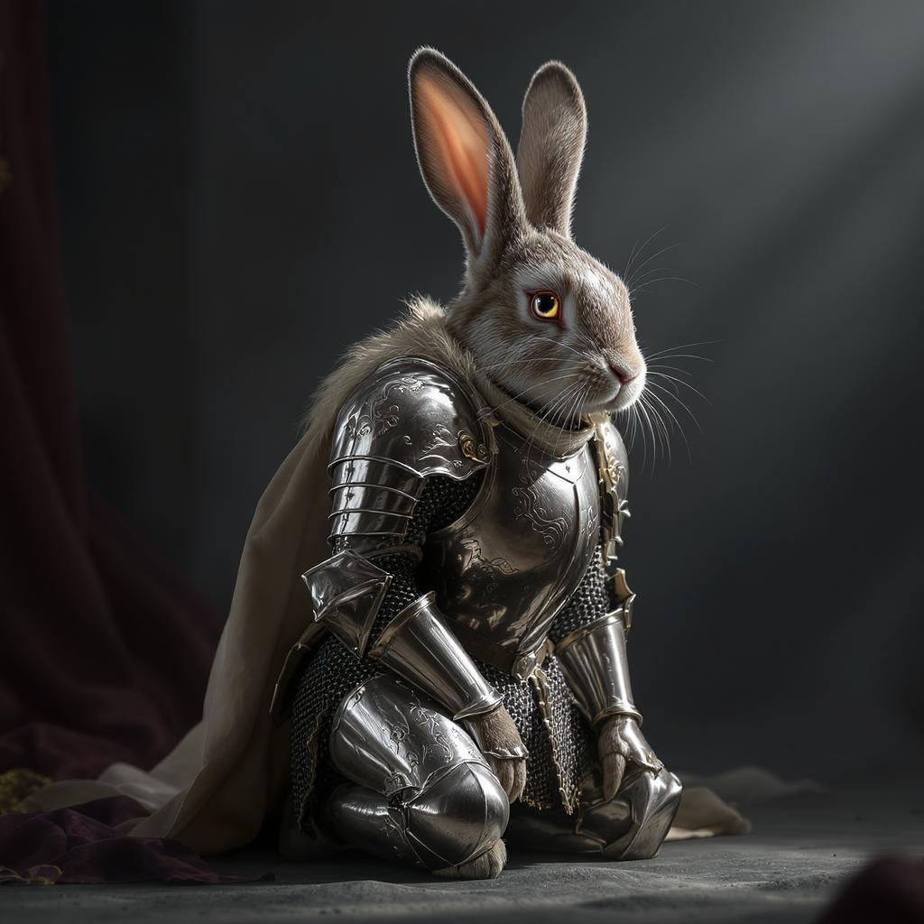 A majestic rabbit knight kneels, its finely detailed armor reflecting the craftsmanship of a master artisan. The silver plates shimmer with intricate designs, interwoven with delicate silk threads that add a touch of elegance. The setting is bathed in cinematic lighting that casts dramatic shadows, highlighting every contour of the armor and the determined expression of the rabbit. Against a backdrop of soft light, the scene captures the essence of bravery and nobility in high-resolution detail, creating an awe-inspiring portrait.