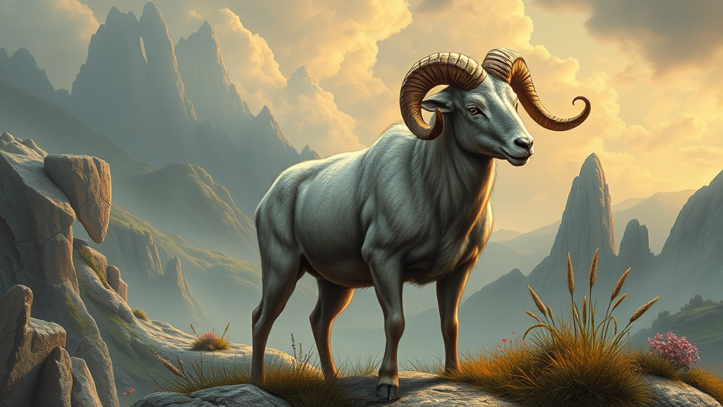 A majestic ram adorned with a single spiraled horn, standing amidst an ethereal landscape, captures the essence of otherworldly illustrations. Inspired by Robert S. Duncanson, the scene merges with the aesthetic of queer academia, showcasing intricate ornamental details. The setting evokes the grandeur of the 18th century combined with the visionary perspective of Olafur Eliasson. The composition, framed in a 3:4 aspect ratio, presents a high-resolution marvel that blends historic elegance with a touch of contemporary imagination.