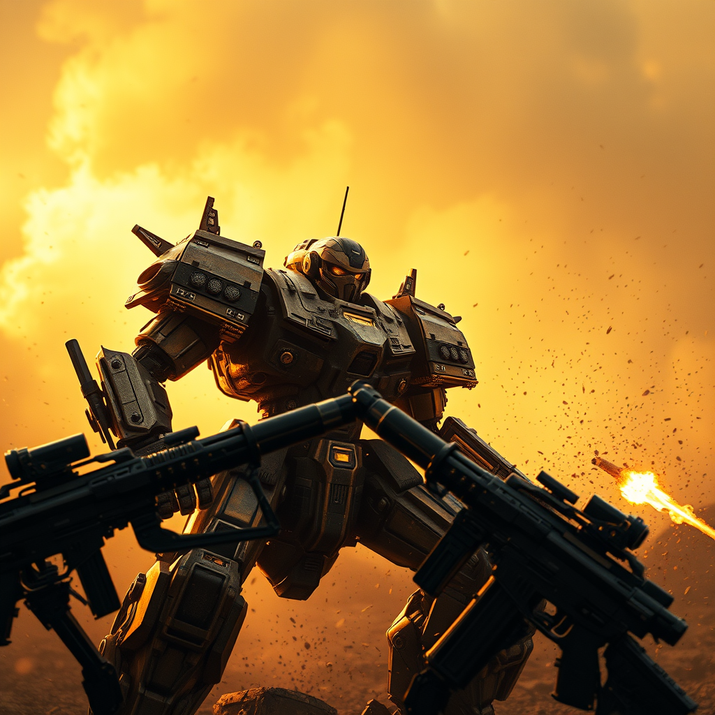 A majestic robot, engaged in battle with a heavily armed adversary, rendered in stunning detail as a true masterpiece. Radiant golden hues reminiscent of Warhammer 40,000, captured in high dynamic range. This epic, hyper-realistic scene is enriched with dramatic, warm lighting that casts intricate shadows, set against a faded yet complex background. The atmosphere exudes cinematic grandeur, inviting viewers to immerse in its breathtaking artistry.