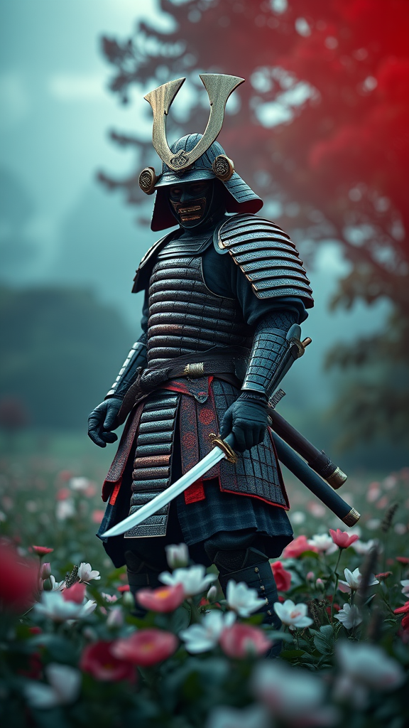 A majestic samurai stands tall in full armor and helmet, wielding a katana on a lush, flower-strewn plain. The scene is captured in breathtaking cinematic quality using Unreal Engine 5, featuring rich color grading and editorial style photography. Shot on a 70mm lens, the depth of field and tilt blur create a striking focus effect, with the shutter speed set at 1/1000 and aperture at F/22. The image boasts a 32k white balance, super-resolution, and megapixel clarity in ProPhoto RGB. Atmospheric lighting is a blend of natural, incandescent, and studio lighting, with optical fiber effects adding a moody ambiance. Volumetric lighting and contre-jour techniques enhance the scene's dramatic mood, while global illumination and ray tracing provide realistic reflections and shadows. A red rim light casts a cool, enigmatic glow over the scene, complemented by scattering and shimmering effects. The composition utilizes techniques like anti-aliasing and advanced shaders for a hyper-realistic, intricately detailed image. In post-production, cel shading, tone mapping, and VFX add a dynamic, elegant touch. The samurai is captured in a dynamic pose, centered in this hyper-maximalist, super detailed epic artwork that combines both CGI and traditional photography elements.