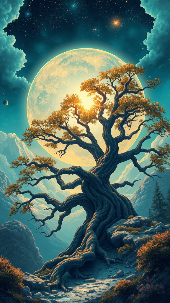 A majestic scene unfolds with an enormous circle symbolizing a human spirit hovering above a gnarled, ancient tree, set amidst a stunning fantasy landscape. The colors are a dynamic blend of teal and bronze, pulsating with vibrant energy. The illustration captures the essence of hikecore, portraying a sublime wilderness that evokes a sense of awe and wonder. The poster art style enhances the breathtaking beauty of this magical realm, inviting viewers to lose themselves in its grandeur.