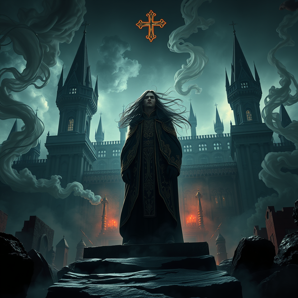 A majestic scene unfolds within a colossal dark castle shrouded in mystery, where a regal figure with long, windblown hair and intricate robes stands amidst swirling clouds of toxic fumes and spiraling ghostly smoke. The vibrant contrast between light and shadow highlights the dramatic ambiance, reflecting orthodox symbolism interwoven with tribal dark fantasy elements. The composition by Massimo Caggese exudes an ominous, intricate aura, captured in ultra-detailed 3D quality using Unreal Engine and Blender. The cinematic lighting and VFX enhance the isometric perspective, creating an ultra-realistic, 8k resolution visual masterpiece akin to Magic: The Gathering art style.
