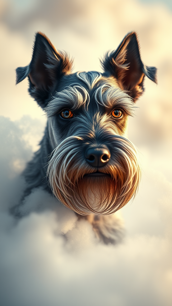 A majestic schnauzer with a shimmering metallic coat, its eyes glowing like neon embers amidst a cloud of softly swirling mist, adorned with exquisite hoarfrost lacework. Bathed in the gentle caress of sunlight, illuminating its intricate details, the creature exudes an air of dreamlike fantasy. A surreal symphony of symmetry and soft lighting, the scene unfolds like a digital painting trending on ArtStation, rendered with the hyper-realism of an Unreal Engine landscape, every detail meticulously crafted to transport the viewer into an ethereal realm.