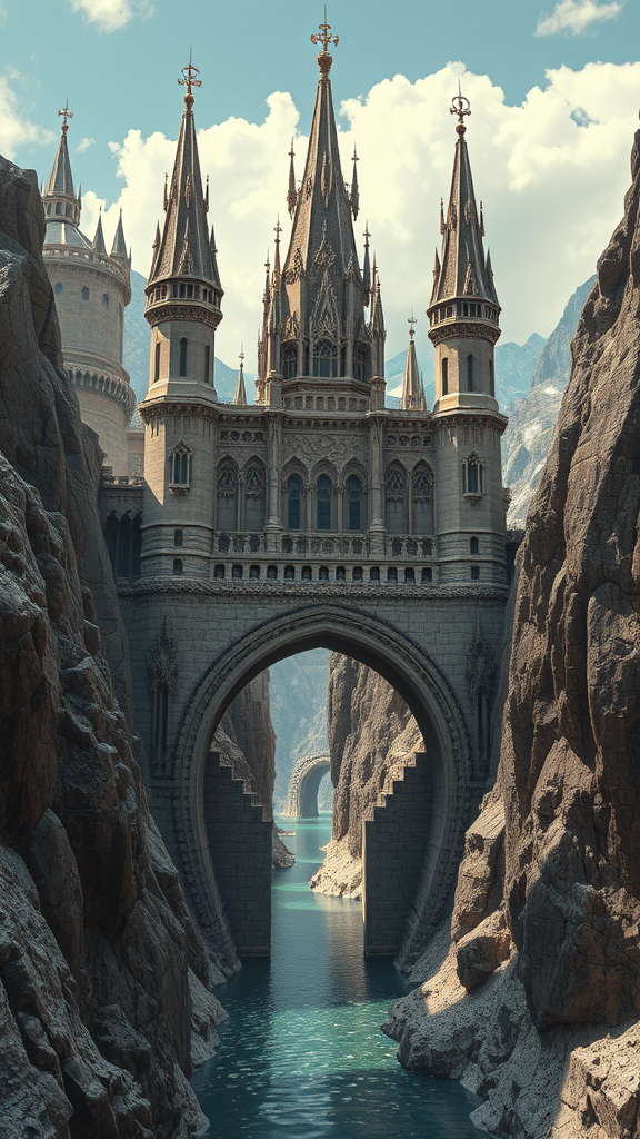 A majestic sculpted castle with intricate stone walls rises amid the rugged terrain of the Rocky Mountains, embodying gothic futurism with its soaring spires and elaborate carvings. The creation draws inspiration from Eve Ventrue's dreamlike detail and Filip Hodas's surreal imagination, presenting a vision of structured chaos where traditional gothic aesthetics merge with futuristic elements. A narrow, arched passage stretches over a shimmering body of water, reflecting the deep azure of the sky above, further enhancing the castle's grandeur. The scene is set in stunning, elaborate detail, with every nook and cranny telling stories of a world where the past and future coexist harmoniously.