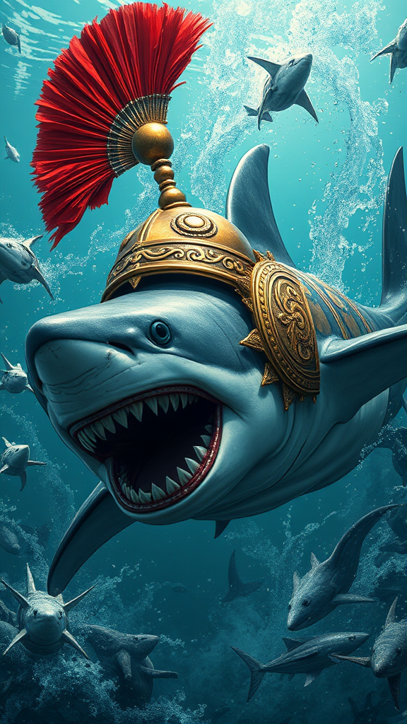 A majestic shark adorned in ancient Roman-inspired armor, featuring a vivid red and gold helmet, swims through the tumultuous waters of a war-torn zone. Its body, encased in intricate, scroll-like arabesque patterns, gleams with realistic detail against a cyan-hued backdrop. The scene is depicted in the style of Xu Beihong and Moosa Al Halyan, echoing their artistic flair. The chaos of the underwater tableau is reminiscent of a wimmelbilder, filled with subtle, hidden details that invite closer examination. Rendered in 8k, the image is a vibrant portrayal of strength and resilience, blending historical grandeur with oceanic mystique.