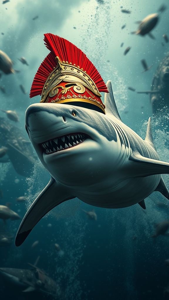 A majestic shark adorned in bright red and gold ancient Roman helmet and armor glides through the waters of a chaotic war zone, its full body elegantly navigating the turbulent scene. Inspired by the style of Xu Beihong, it merges realism with artistic flair, incorporating elements of Moosa Al Halyan's appropriation art. The shark's form is captured in high-definition 8k rendering, with intricate arabesque and scroll details embellishing its armor, creating a mesmerizing, elaborate wimmelbilder composition in cyan tones, evoking a surreal and captivating vision amidst the watery turmoil.