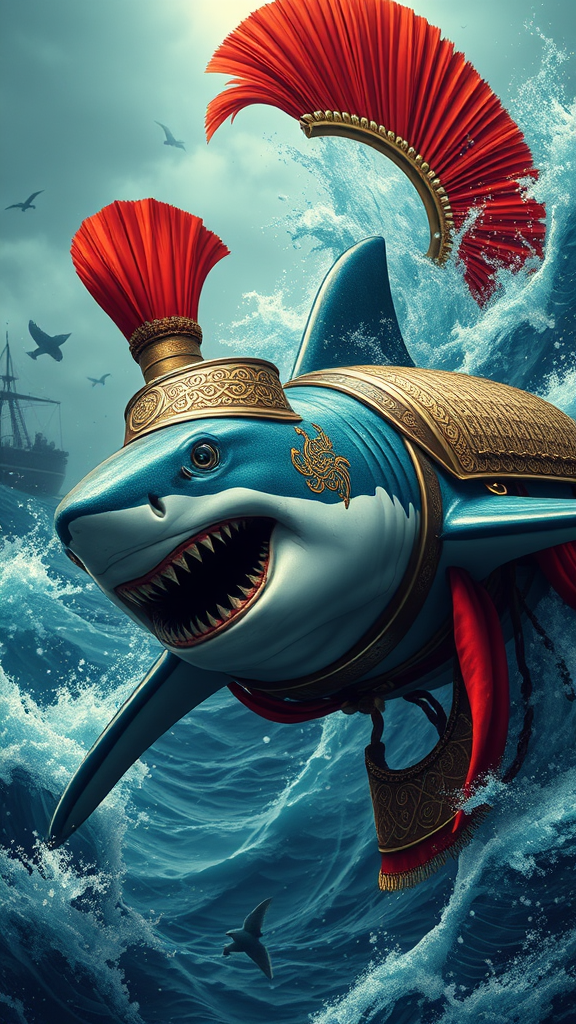 A majestic shark adorned in vibrant ancient Roman armor and a striking bright red and gold helmet, its whole body gliding gracefully through the turbulent waters of a war-torn seascape. The scene, reminiscent of a Xu Beihong masterpiece, embraces the style of an appropriation artist like Moosa Al Halyan, capturing a hyper-realistic depiction with rich cyan tones. Intricately detailed arabesque and swirling scroll patterns cover the armor, blending seamlessly into the chaotic backdrop. The composition draws inspiration from wimmelbilder, offering an 8k high-resolution render that is both captivating and meticulously detailed.