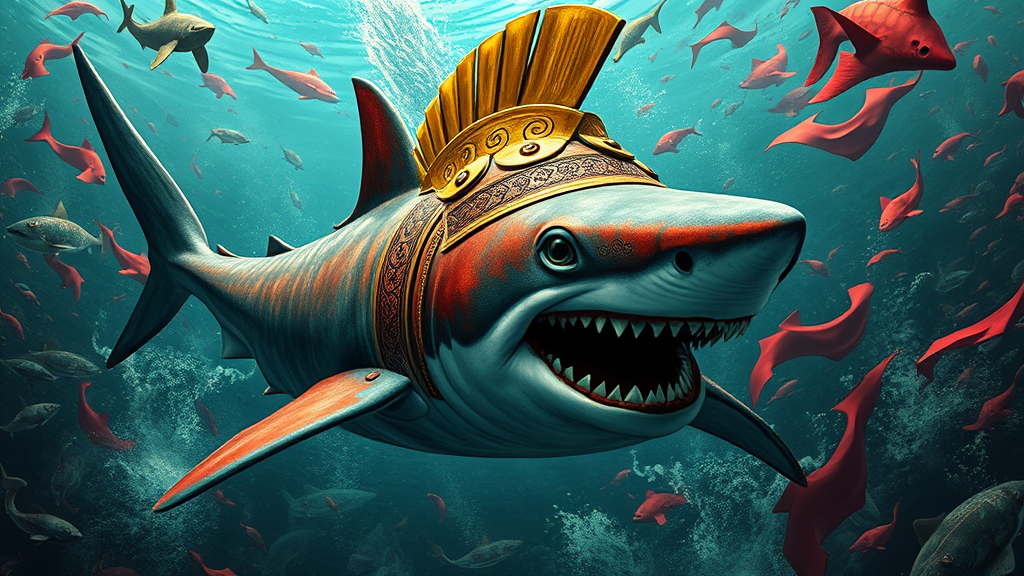 A majestic shark clad in ancient bright red and gold Roman helmet and armor navigates through a tumultuous underwater war zone, its powerful form cutting through the chaotic aquatic landscape. Evoking the artistry of Xu Beihong with the innovative touch of appropriation artist Moosa Al Halyan, the scene is rendered in striking realism, highlighted with shades of cyan. Delicate arabesque and scroll-like patterns accent the armor, blending seamlessly into the complex, bustling background reminiscent of a wimmelbilder. The entire scene is captured in stunning 8k detail, revealing the intricate textures and vibrant hues that bring this extraordinary creature to life.