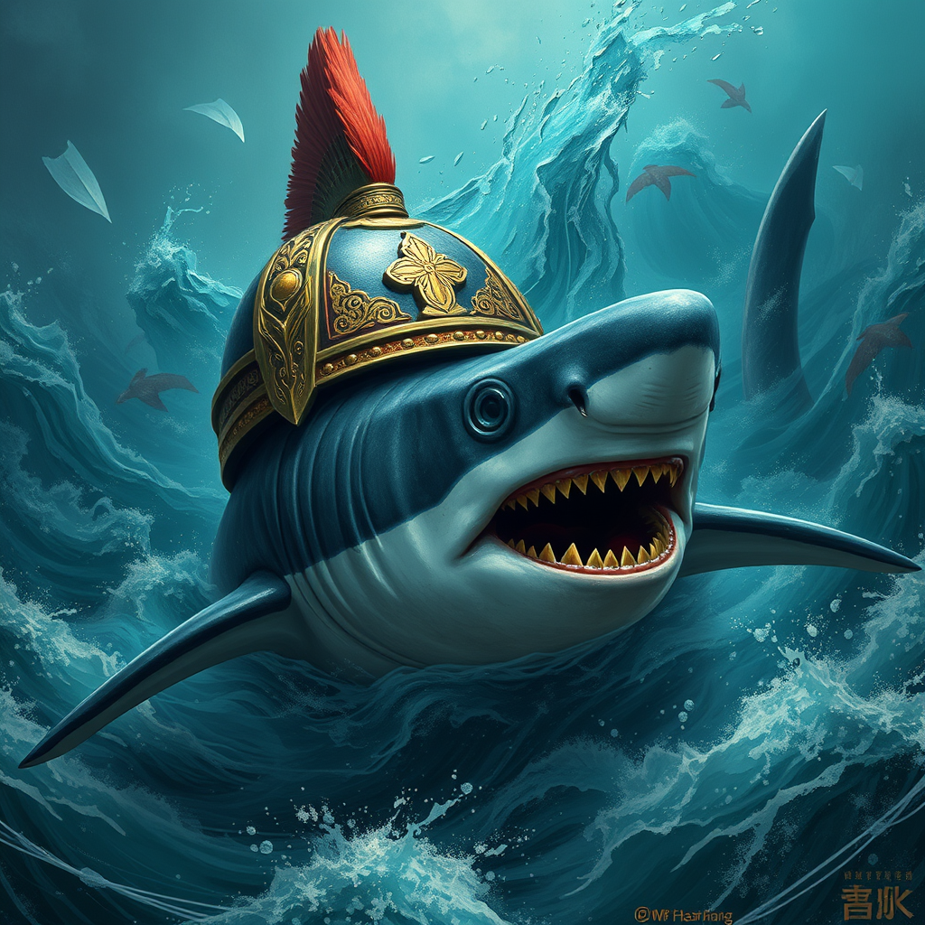 A majestic shark glides through turbulent wartime waters, adorned in ancient Roman armor with intricate bright red and gold details. Its helmet, a relic of another time, shines amidst the chaos, exuding authority and resilience. In the style of Xu Beihong and Moosa Al Halyan, the scene is realistic and rendered in stunning 8k detail. The colors are a striking palette of cyan, complemented by arabesque scroll motifs that swirl around the shark, adding an element of fluid elegance to its powerful form. The background is a wimmelbilder masterpiece, filled with subtle narratives and hidden stories, capturing the essence of a world in upheaval.