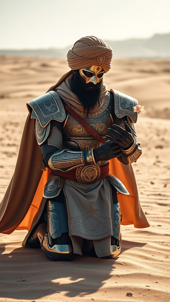 A majestic Sikh ruler from the 1800s, adorned with a resplendent turban and encased in a Japanese-inspired mecha exoskeleton reminiscent of Gundam and Warhammer, kneels gracefully in a barren desert landscape. The carbon-fibre exosuit, adorned with intricately engraved gold Punjabi script, exudes an aura of mystical energies. The suit, embodying neo-futuristic technology, features artful engravings that glow with an ethereal light, echoing the romantic touch of Billelis art. A long, regal cape billows behind the monarch, whose face is shrouded by a sleek metal mask. In a gesture embodying serenity and hope, he tenderly reaches for a delicate flower amidst the desolate sands, embodying a harmonious blend of past and future. Daylight bathes the endless desert, highlighting meticulous details inspired by Akira and Star Wars, akin to the artistry of Norman Rockwell, Syd Mead, Boris Vallejo, and Jean Giraud Moebius. The scene evokes the narrative depth of Akira Kurosawa and the dramatic flair of Eugéne Delacroix and Rembrandt van Rijn, capturing a peaceful yet profound moment within a dreamlike expanse. The image is infused with the subtlety of "blink and miss" details, set against the vast, uninterrupted horizon, offering a fusion of historical romanticism and futuristic ingenuity.
