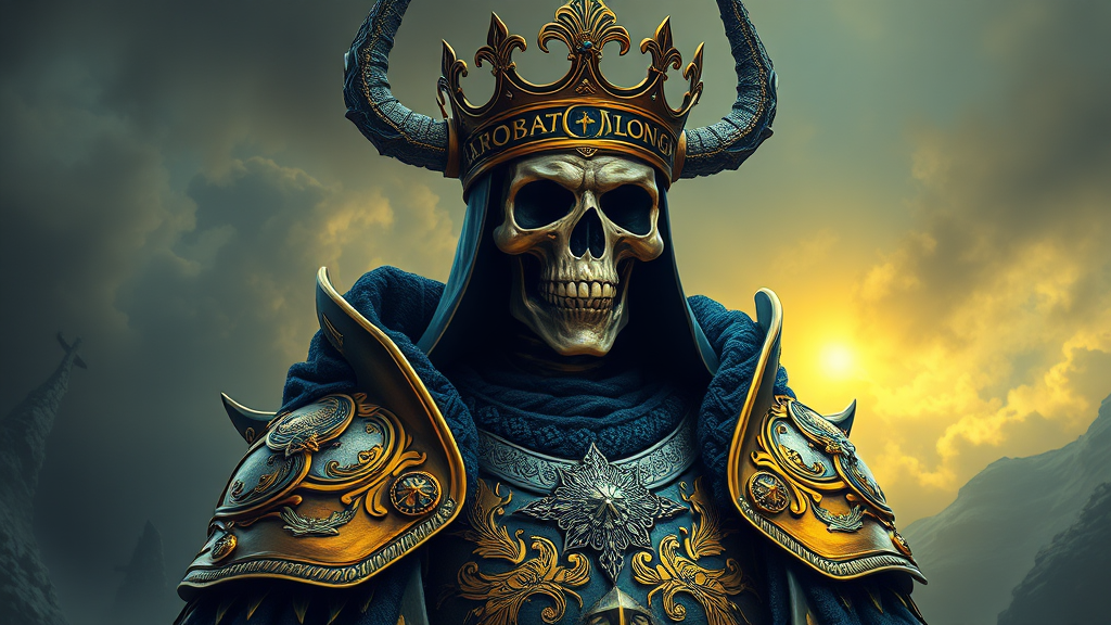 "A majestic Skeleton King of Hell adorned in intricately designed Nordic armor, showcasing an elegant blend of royal yellow and ultramarine blue hues. The digital illustration is scenic, hyper-realistic, and hyper-detailed, capturing an air of regal sophistication. Inspired by the styles of Artgerm, WLOP, Greg Rutkowski, and BROM, the image features the king set against a dramatic and atmospheric background. The Nordic armor is adorned with elaborate engravings and motifs that reflect ancient traditions. The overall composition evokes a sense of power and mystery, with subtle creative elements that enhance the mystical and formidable presence of the Skeleton King."