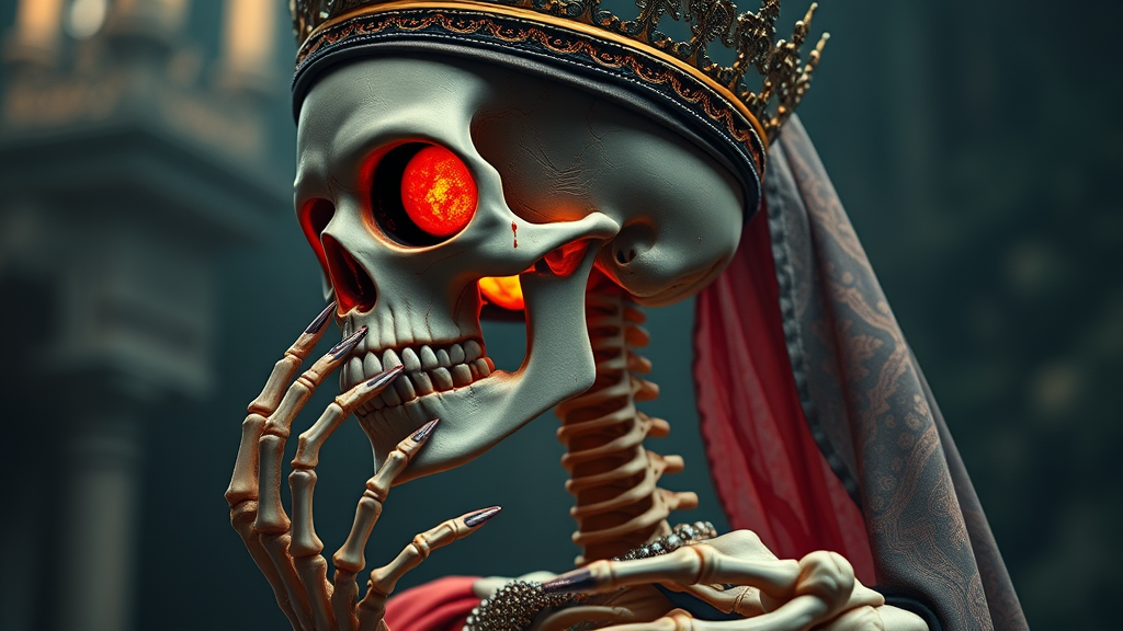 A majestic skeleton woman adorned in regal attire, crowned as the queen of the underworld, possessing vibrant coloration around her eye sockets yet hollow within; her skeletal form is marked by traces of blood and veins, intricate and highly detailed. She is posed sideways, embodying the essence of the living dead with a morbid, unholy allure. This fantastical image is extremely intricate and cinematic, rendered in hyper-realistic detail at an absurd resolution in 4K and 8K UHD with HDR contrast. Her appearance is gloriously monumental, imagined without any deformations or imperfections, her anatomy flawlessly drawn with impeccable beauty across her skeletal form, hands, and features, offering an unhindered view of her fantastical, sublime presence.