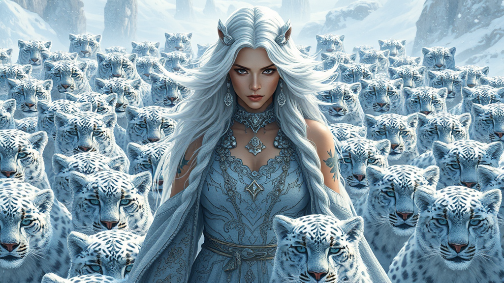A majestic snow leopard goddess woman, portrayed in a digital illustration with a full-body view. Captured in a dynamic, wide-angle shot, her tense expression reflects focus and intensity. Her flowing white hair complements her ethereal presence, as she stands surrounded by a gathering of dozens of snow leopards. The composition is both interesting and photorealistic, emphasizing her powerful aura and connection to the leopards. The scene is rendered in stunning 8k resolution, featuring super detailed artistry, capturing a masterpiece quality. Set against a dramatic snowy backdrop, the image radiates an otherworldly essence, achieving a remarkable blend of realism and fantasy.