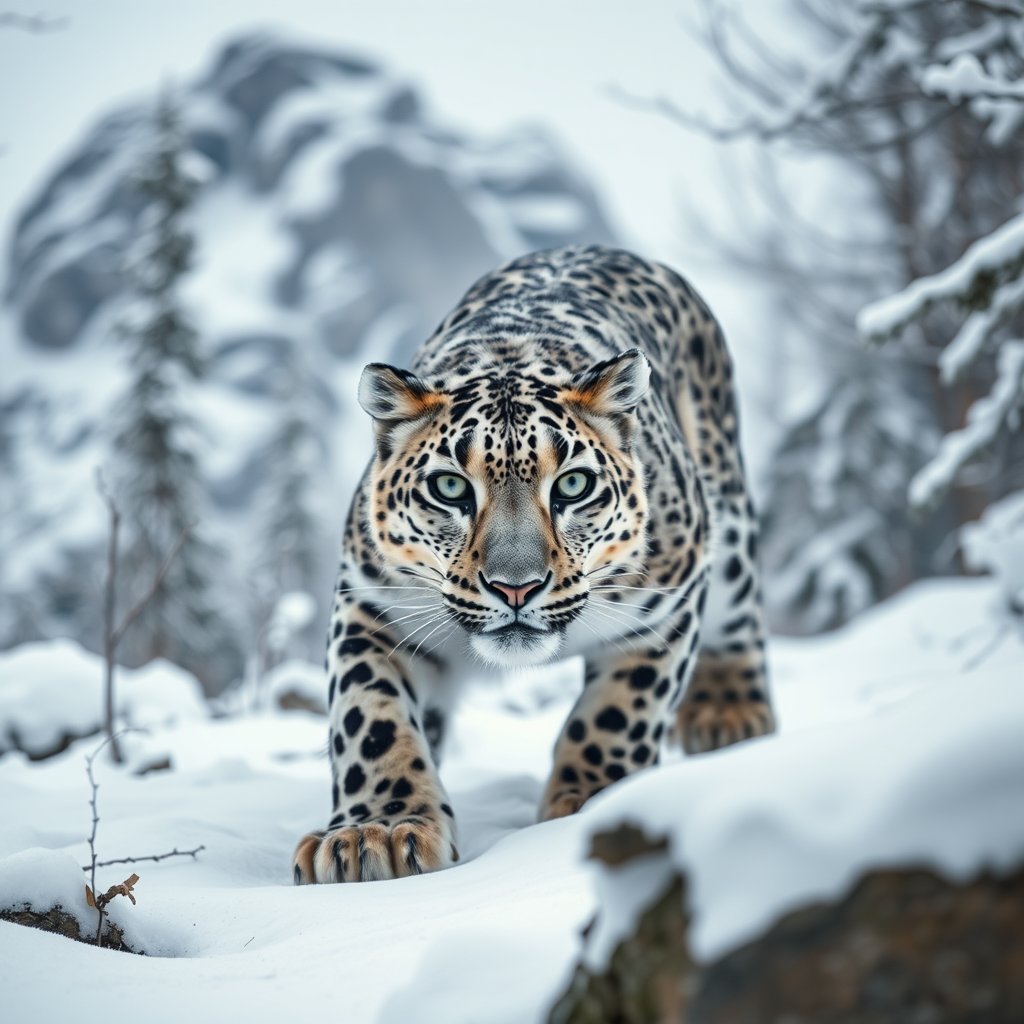 A majestic snow leopard prowling through a snowy rocky mountain forest on an overcast day, its full body captured in a highly detailed, high-resolution medium shot. The feline's intense gaze meets the viewer's eye, exuding a predatory aura. The image is characterized by hyper-detailed eyes and crisp focus, enhanced by the natural lighting that illuminates the snow-draped landscape. Subtle shadows and contrasts highlight the intricate patterns of its fur, contributing to the powerful presence of the creature in this award-worthy photograph.