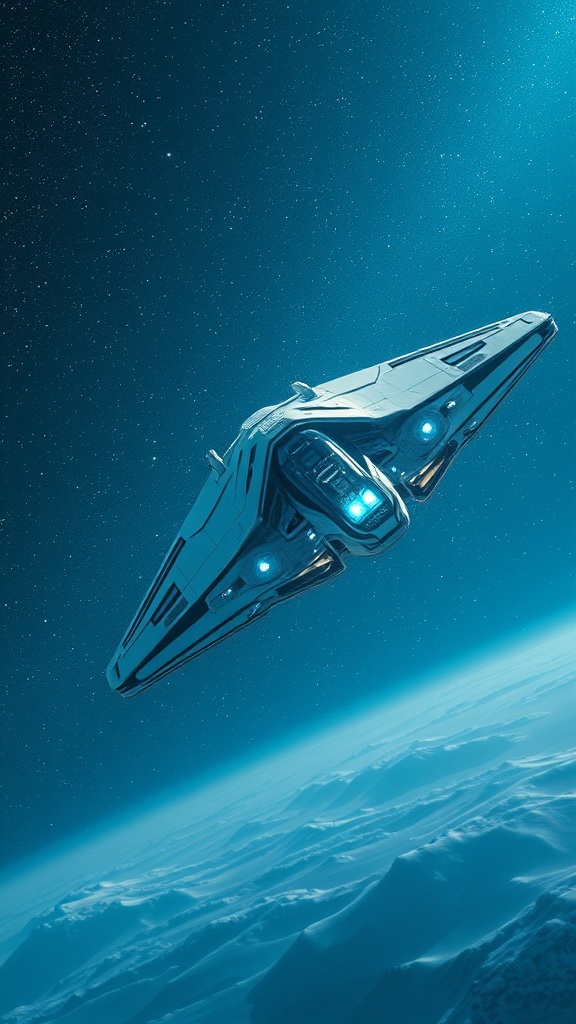 A majestic spacecraft glides into view from a cosmic distance, evoking Star Wars' grandeur, captured in cinematic stills reminiscent of an Olympus AF-1. The scene is awash in a light gray and blue palette, with fragmented planes of light gray and dark emerald cutting through the vista, reminiscent of futuristic frostpunk landscapes. The vessel cuts through a sea of stars, its intricate design highlighted in light indigo and white hues that reflect the ultra-high definition clarity of 32k UHD. The close-up view reveals intricate details, making one exclaim, "I can't believe how beautiful this is." This digital art masterpiece, inspired by changelingcore aesthetics and the grandeur of an IMAX experience, merges photo-realism with science fiction brilliance, evoking awe and wonder.