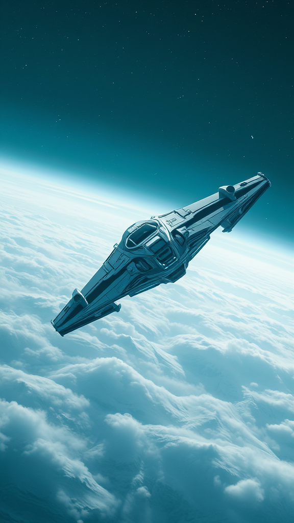 A majestic spacecraft gliding gracefully through the cosmos, reminiscent of Star Wars, captured in the style of an Olympus AF-1 cinematic still. The scene is bathed in light gray and blue hues, evoking a sense of wonder and beauty. Fragmented planes and a contrasting mix of light gray and dark emerald tones enhance the ethereal atmosphere, while a sense of frostpunk pervades. The spaceship gradually enters the frame from a distance, echoing the style of #vfxfriday. Its design hints at changelingcore influences, bringing a unique fusion of organic and mechanical elements. Presented in an IMAX close-up, the ship's intricate details are vividly displayed, highlighting the light indigo and white accents. With 32k UHD clarity, this digital art photo embodies the essence of breathtaking science fiction.
