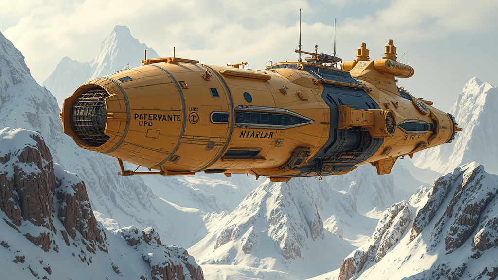 A majestic spaceship, crafted with a fusion of yellow and beige hues, floats elegantly amidst snow-laden landscapes, exuding a grandeur reminiscent of fantastical ruins. Inspired by the ornate style of Viktor Vasnetsov and the industrial elegance of Dariusz Klimczak, the scene unfolds with intricate world-building. The vessel hovers over frosted peaks, its design a testament to monumental architecture, interwoven with elements of degradation and time-worn beauty reminiscent of a bygone era. Rusty debris and colossal forms evoke the visionary work of Leszek Bujnowski, with a modular construction that pays homage to the precision and artistry of Alexei Harlamoff. Each detail is meticulously crafted, a high-definition masterpiece of futuristic reverence and architectural prowess.