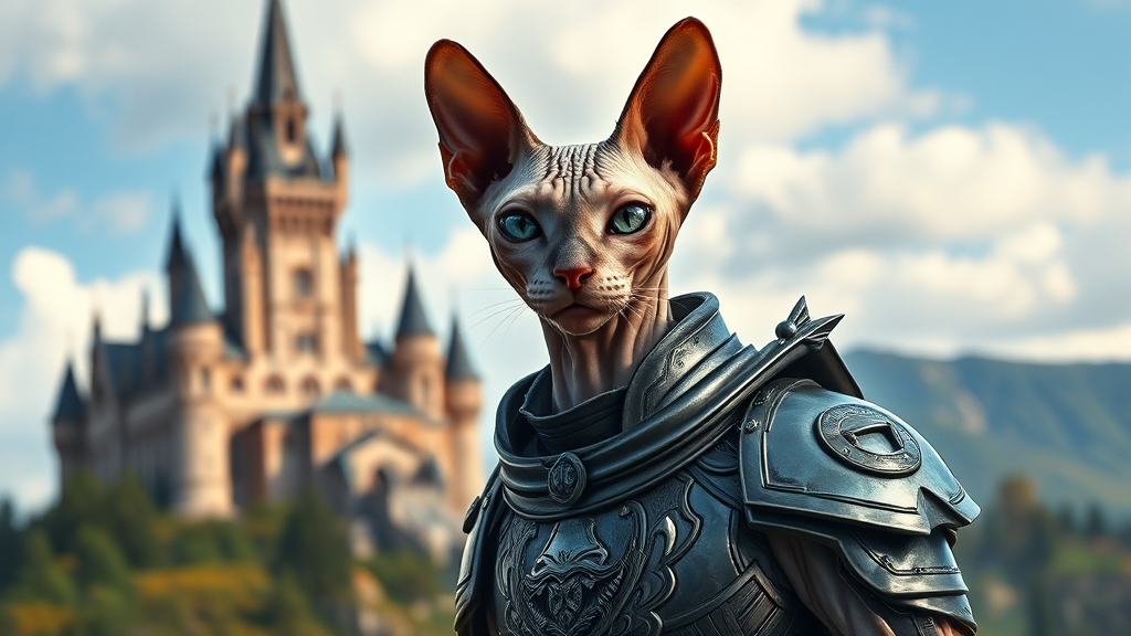 A majestic sphynx cat clad in intricate armor standing proudly in the open with a grand castle towering in the backdrop. This high-resolution and sharply focused RAW image captures the feline's unique features and the surrounding landscape with outstanding clarity, presenting an exquisite UHD and HDR visual experience. The cat's character is highlighted with an elegantly elongated neck, its expression curiously attentive and its wide-set eyes keenly focusing forward, adding a playful touch to its regal stance. Despite the fantastical setting, the photo maintains a seamless realism, devoid of any digital distortions such as cropped visuals, low-resolution elements, or unwanted signatures and watermarks.